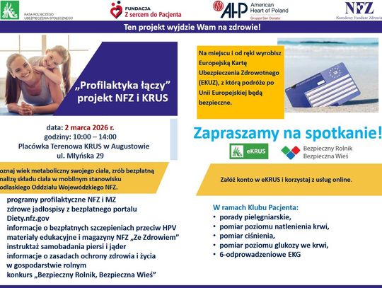 „Profilaktyka łączy” jest programem ogólnopolskim wdrożonym też w Augustowie. Pierwsza edycja akcji koordynowanej przez KRUS i Narodowy Fundusz Zdrowia odbyła się jesienią 2024 roku. Natomiast najnowsza odsłona miała miejsce w naszym mieście 2 marca 2026 roku. Było to bardzo ważne spotkanie dla rolników i mieszkańców terenów wiejskich z obszaru powiatu augustowskiego. Przeprowadzono konkurs z nagrodami z wiedzy o bezpieczeństwie z wykorzystaniem „koła fortuny”. Po zakręceniu kołem oraz wylosowaniu kategorii, uczestnik konkursu otrzymywał pytanie i po udzieleniu dobrej odpowiedzi zwycięzcy wręczono nagrodę.