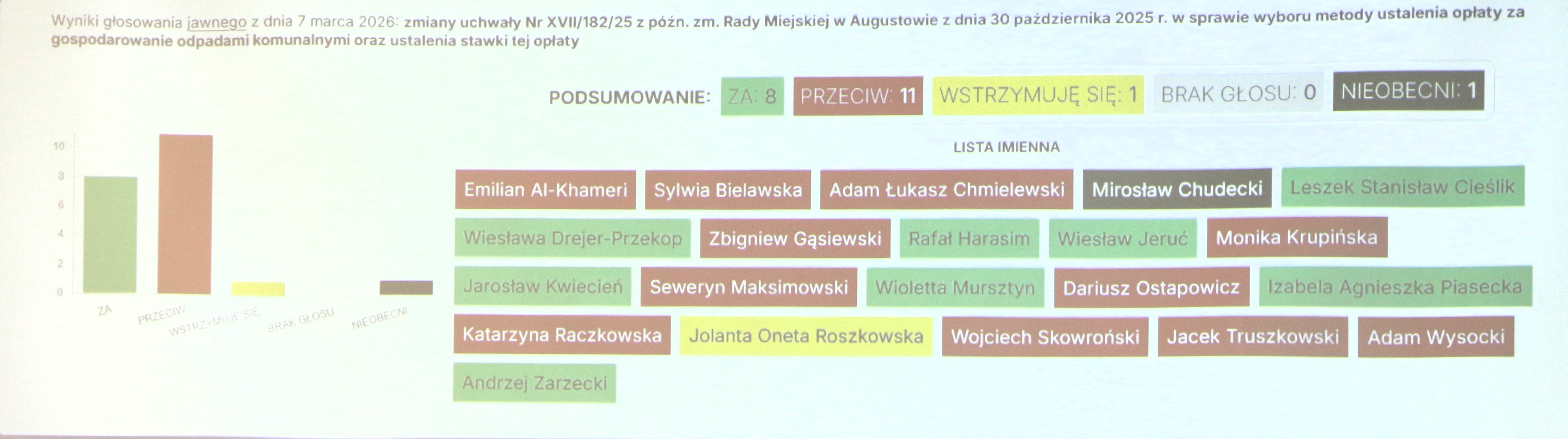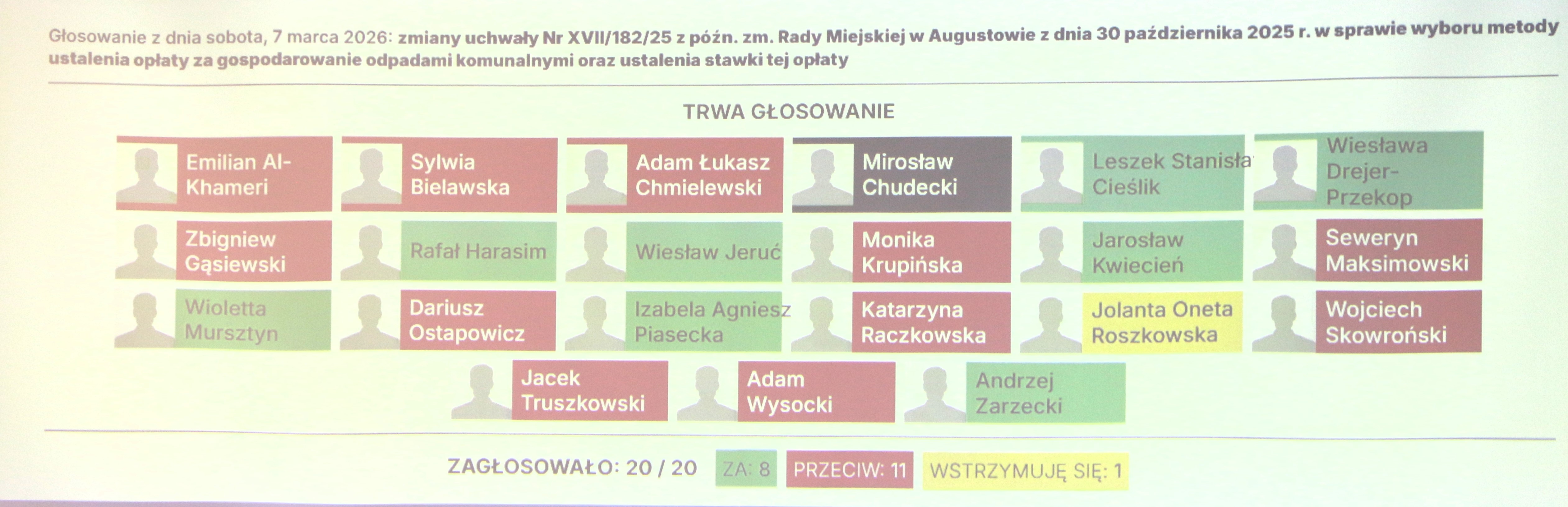 Przeciwko projektowi uchwały głosował m.in. radny Emilian Al-Khameri, który mocno ubolewał nad tym (i kilkukrotnie dał temu wyraz), że wkrótce w mediach pojawi się artykuł informujący, iż radni związanego z nim ugrupowania Nasze Miasto oraz PiS głosowali przeciwko zaproponowanej zmianie. Oto głosowanie: