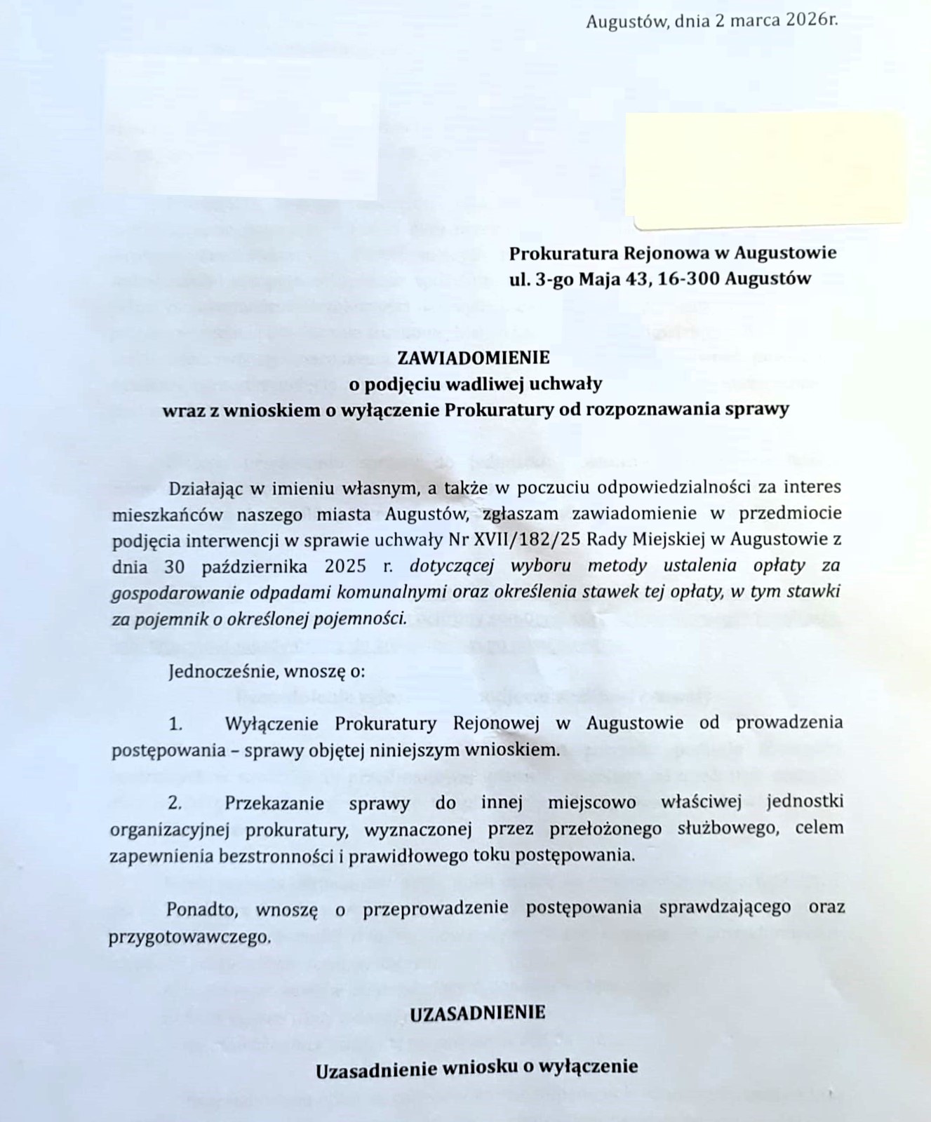 Działając w imieniu własnym, zgodnie z art. 50 § 1 w zw. z art. 52 § 1 w zw. z art. 53 § 1 i w zw. z art. 3 § 2 pkt 5 ustawy z 30 sierpnia 2002 r. – Prawo o postępowaniu przed sądami administracyjnymi, dalej jako p.p.s.a., zaskarżam w całości uchwałę Rady Miejskiej w Augustowie o numerze XVII/182/25 z dnia 30 października 2025 r. w sprawie wyboru metody ustalania opłaty za gospodarowanie odpadami komunalnymi oraz ustalenia stawki tej opłaty, ustalenia stawki opłaty za pojemnik o określonej pojemności.